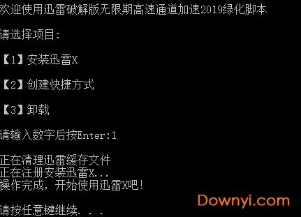 2、输入数字“1”,点击键盘上的“enter”键,看到提示“操作完成,开始使用迅雷x吧!”即成功安装,桌面上会生成一个迅雷x快捷方式;