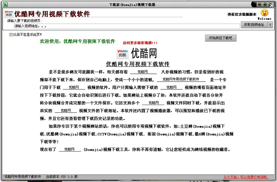 优酷(downjia)视频下载器是一个专门用于下载各大视频网的软件。共支持的网站用户只需输入需要下载的视频网视频的观看页面地址并按下下载按钮,它就会自动识别后进行下载。如果你专注于某个视频网站的话,你也可以使用专项视频下载软件,如土豆网视频下载(downjia) ,优酷网视频下载(downjia) ,cctv视频下载(downjia),新浪视频下载(downjia),酷6网视频下载(downjia)等。