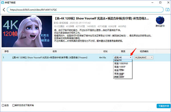 6、另外它支持批量下载,如果是番剧可以直接解析所有剧集,你可批量选择下载,而且还能选择清晰度。