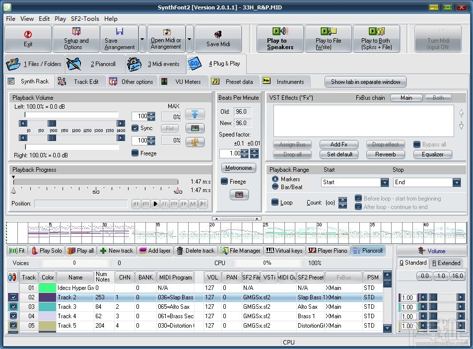 当在一次分配到几个曲目VST乐器,SynthFont这样的(因为版本1.500)分配不同的实例每个轨道。 1.500以前的版本相同的单实例被分配