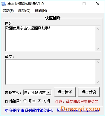 宇宙快速翻译助手是绿色免费的,简单好用的可以快速帮助你翻译的软件。该软件在生活中非常的实用,比如你在看新闻或者小说的时候,出现了某个英文签名,你想看看是什么意思,那么你只需要把原文复制到里面,然后点击翻译即可转换为自己需要的。
