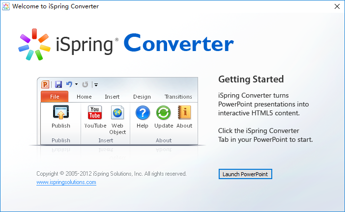 基于 giveaway of the day 免费赠送版制作绿色免安装版,第一次使用先运行 !)ispringconverterportable.exe 完成初始化安装,然后通过 ispringlauncher.exe 打开 powerpoint,就能看到 ispring converter 工具栏了,当前版本 ispring converter 6.2.0.3421, ispring converter 目前仅支持 powerpoint 2007 和 2010。