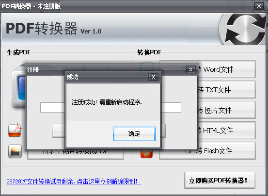 3、提示注册成功,重新启动软件