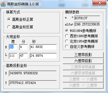 打开高斯坐标转换器,坐标正算是将经纬坐标转化为高斯平面直角坐标,坐标反算是将高斯平面直角坐标转化为经纬坐标,然后选择相应的椭球参数和投影带。