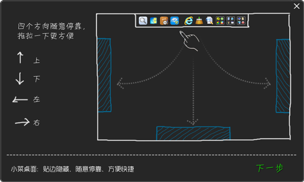 3、添加各种常用图标,便捷管理桌面图标。而且可以自定义网址的快捷方式,把图标进行分组放入一个集合等操作 操作便捷 可以拖动桌面上的任意图标到小菜桌面,也可以把图标拖到小菜桌面之外进行删除,而4、且小菜会自定贴边隐藏,可以停靠在屏幕的上下左右四个方向,