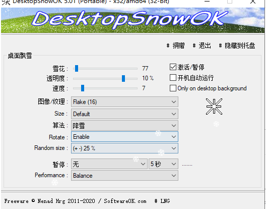 还能够神奇的调整桌面雪花的数目以及多样的速度和快速但是以及大小操作。