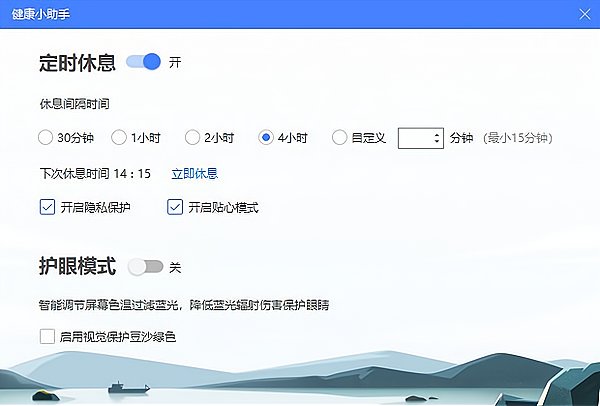 360健康小卫士是可以让用户在使用电脑的过程之中健康护眼的健康上网工具,用户可以自己设置电脑的休息时间和开启护眼模式,护眼模式可以有效保护用户的视力不受伤害。