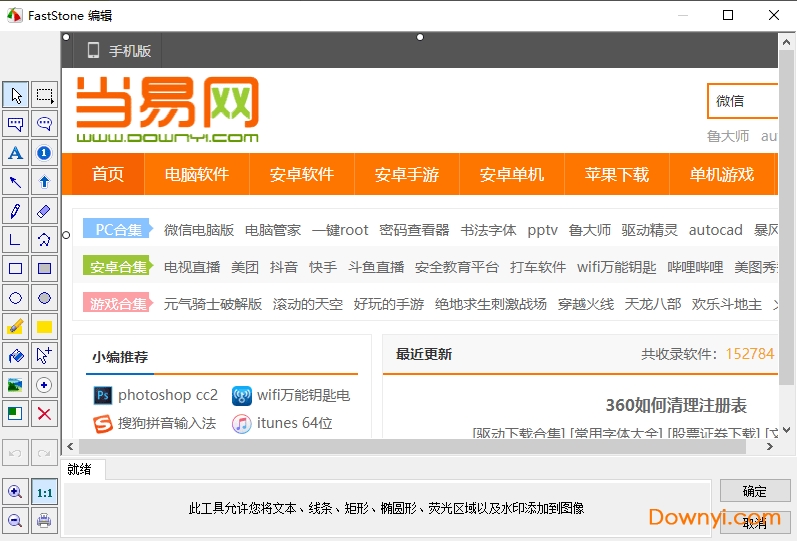 FSCapture还包括快速浏览/编辑图像的功能,可以点击主窗口的“打开”图标快速打开一幅图片,进行简单的缩放、裁切、旋转、加文字等轻量级的操作。把网页中图片拖到FSCapture的窗口上,会快速打开图像浏览窗口。