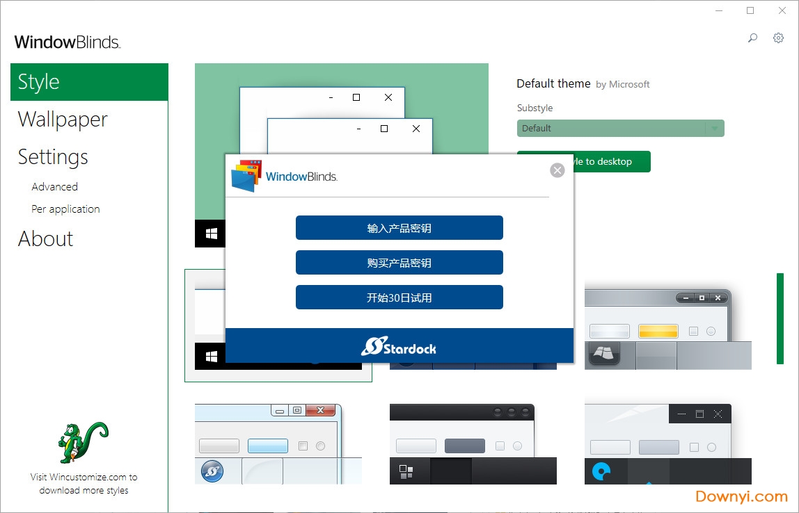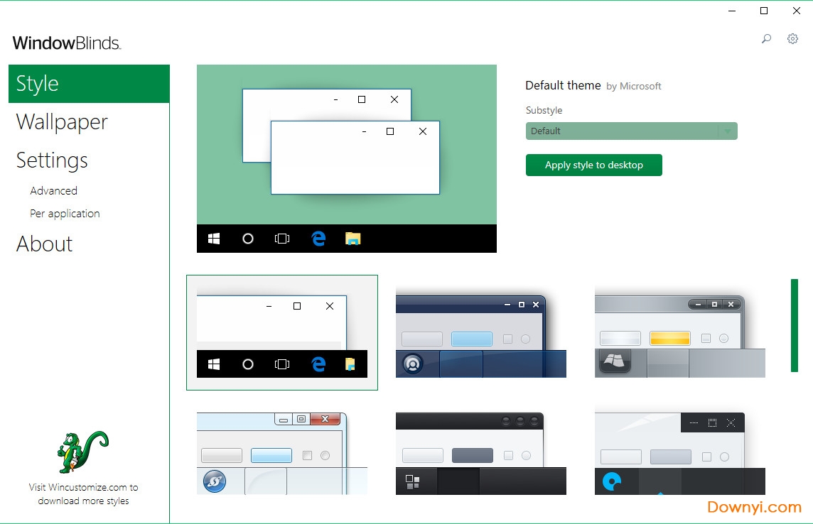 可以帮助你在软件上修改界面风格的应用程序,提供的风格类型很多,你可以在主界面找到十二个不同类型的桌面风格,每个风格都提供一个预览效果,你可以预先查看win的任务栏风格,查看win图标的样式,查看窗口风格,从十二个风格找到一个自己喜欢的并双击使用;stardockwindowblinds界面虽然是英文的,但是使用不复制,用户只需要双击一个风格就可以替换自己当前的桌面!