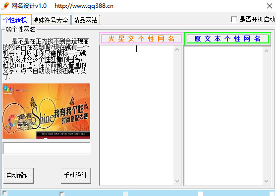 qq网名设计转换器是一款专门为qq用户打造的网名设计工具,提供火星文和简体字的转换以及网名字符美化功能,软件无需安装,下载即可使用,快来下载试用设计你的qq网名吧!