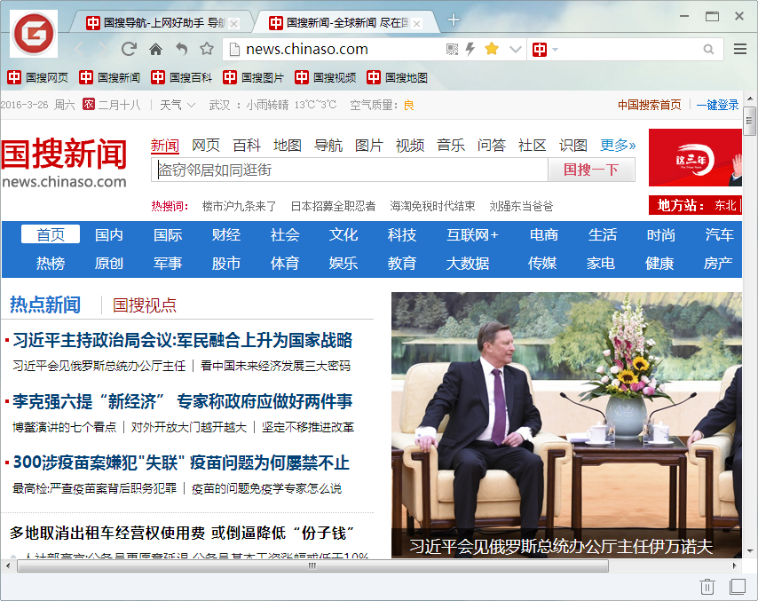 中国搜索(简称“国搜”,www.chinaso.com)是由中央七大新闻单位——人民日报、新华社、中央电视台、光明日报、经济日报、中国日报、中国新闻社联手打造的国家级互联网高新企业,强大的跨媒体、融媒体、新媒体传播载体,权威的互联网百科、数据、资料库,丰富多彩的互联网+创新应用平台。中国搜索顺应全球新一轮科技革命的新潮流,以努力建设世界一流搜索引擎为追求,以创新驱动和媒体融合发展为理念,以拓展互联网+应用服务为引领,以更好地满足国家、社会、大众需求为导向,运用大数据、云计算、物联网、智能化等信息化新技术,增强市场竞争力和社会影响力,集聚媒体融合传播正能量新能量,着力体现国家搜索的权威性、公正性、互动性、精准性,不断提升用户满意度和优化用户个性体验。