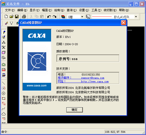软件安装完整后,打开主菜单"帮助"的"关于CAXA线切割"项,弹出的画面的"版本"中有"XPr1"字样,即证明更新成功;
