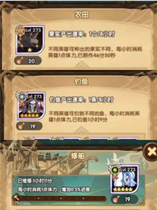 农田、钓鱼、修船:都是每小时消耗1点体力=24点体力/天,扣除每天可恢复的20点体力。只要上一个英雄,然后5天后进行更换一次即可。