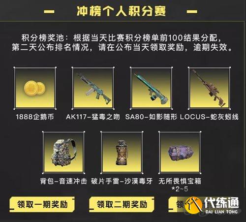 当战士们积分达到每期排名前100位时,就有机会获得1888企鹅币,AK117-猛毒之吻、SA80-如影随形、Locus-蛇灰蚓线等不同等级的奖励。(奖品根据前100名排名结果分配)