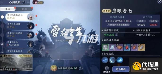在普通难度下,玩家最好使用1T、7DPS、2天香、移花搭配。针对鹰眼老七,玩家注意它一技能雷电狂袭,呼唤雷电之后,打出多轮攻击,从而造成殷雷之侵。鹰眼老七这些小落雷较为集中,玩家们要躲避开。